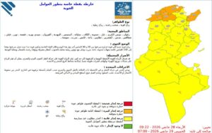 تم إسناد اللون البرتقالي لأربع ولايات وهي جندوبة وباجة وبنزرت ونابل في خارطة اليقظة المؤمنة بالموقع الرسمي للمعهد الوطني للرصد الجوي مما يعني درجة إنذار عالية وضرورة ملازمة الحذر. حيث من المتوقع هبوب رياح قوية آخر نهار هذا اليوم تكون قوية جدا أثناء الليل لتصل مؤقتا 100 كلم/س بهذه الولايات وبالمرتفعات الغربية كما تكون مثيرة للاتربة والرمال بالجنوب.