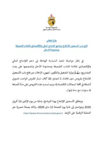 أعلنت وزارة التشغيل والتكوين المهني اليوم الاثنين، في بلاغ لها، عن فتح باب التسجيل للانتفاع ببرنامج الادماج المالي والاقتصادي للفئات الضعيفة ومحدودة الدخل، وذلك بداية من 13 أفريل الجاري إلى غاية 15 ماي 2026.